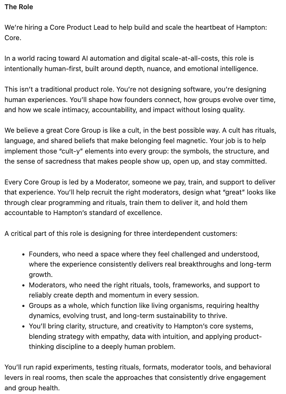 Part of what I love about working at Hampton is collaborating with Sam Parr, one of our founders and an epic copywriter3. I often find myself going toe to toe with him on language, as we push each other toward sharper, more compelling writing. I wrote this job description with soul. Then, he pushed me farther. I never would have used the word “cult” in a job description at past jobs. That’s why I love Hampton.