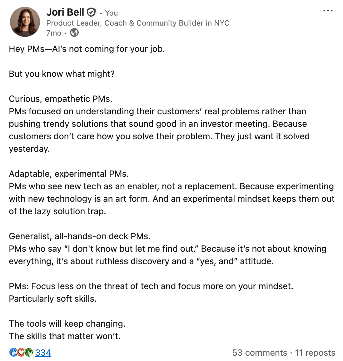 I was genuinely frustrated with what I was seeing then (and now) around how AI is impacting the product function. My authenticity came through and I tapped into something fiery in myself that clearly touched something fiery in other people.
